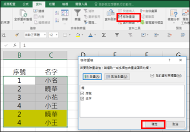 把資料選起來之後,點「資料」右邊中間的「移除重複」,確認重複的欄都有打勾之後,按確定,重複的資料就會被移除。